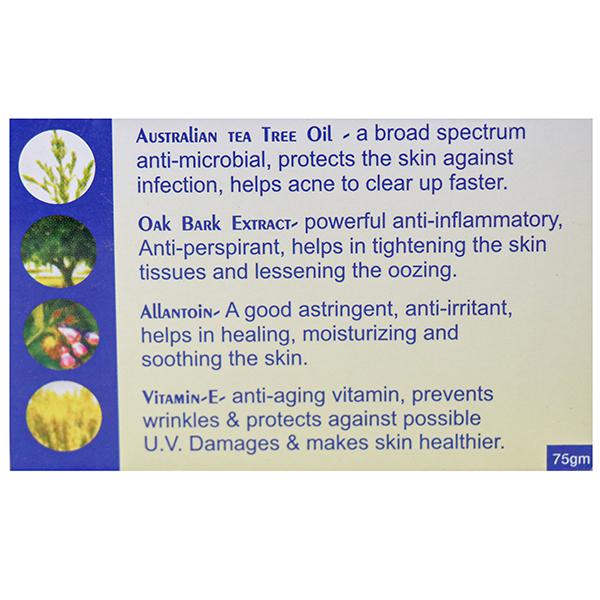 Allantoin, Vitamin E Acetate (liquid), Tea Tree Oil, Light Liquid Paraffin, Butylated Hydroxytoluene, Oak bark extract, Titanium Dioxide, Tinoguard TT, Blend EDTA, Soap Noodles.