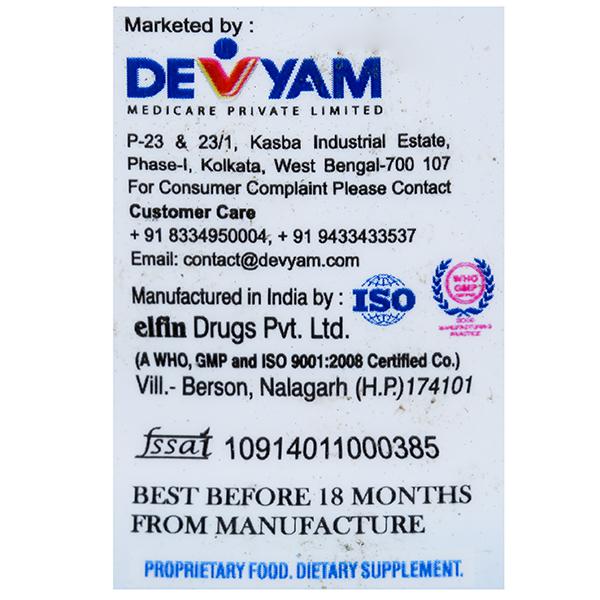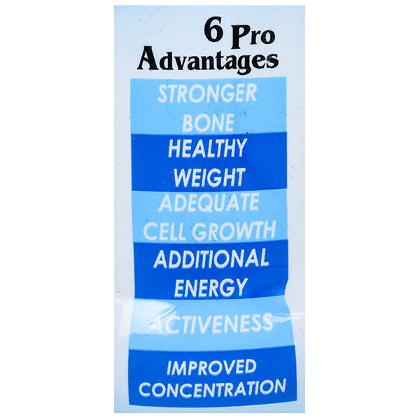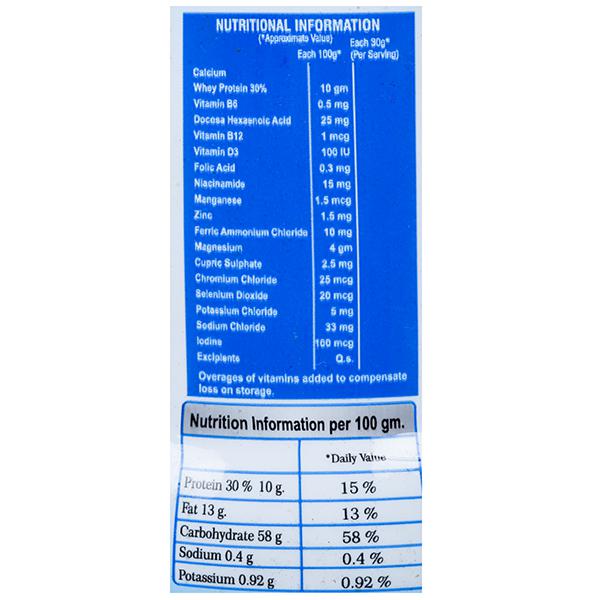 Calcium, Whey Protein 30%: 10 g, Vitamin B6: 0.5 mg, Docosa Hexaenoic Acid: 25 mg, Vitamin B12: 1 mcg, Vitamin D3: 100 IU, Folic Acid: 0.3 mg, Niacinamide: 15 mg, Manganese: 1.5 mcg, Zinc: 1.5 mg, Ferric Ammonium Chloride: 10 mg, Magnesium: 4 g, Cupric Sulphate: 2.5 mg, Chromium Chloride: 25 mcg, Selenium Dioxide: 20 mcg, Potassium Chloride: 5 mg, Sodium Chloride: 33 mg, Iodine: 100 mcg, Excipients Q.S.