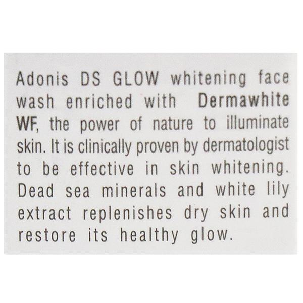 DS Glow Face Wash is enriched with Dead Sea Minerals DC193, Castor Oil, White Lily Extract, Rose marry Extract, Menthol, Purified water, Methyl Paraben sodium, Cathon CG, Propylene Glycol, Ultrez 20, Hydroxy Ethyl Cellulose, Sodium Layurl Ether sulfate, Mayasol, CAPB, Perfume, EDTA. It is used to lighten skin tone.