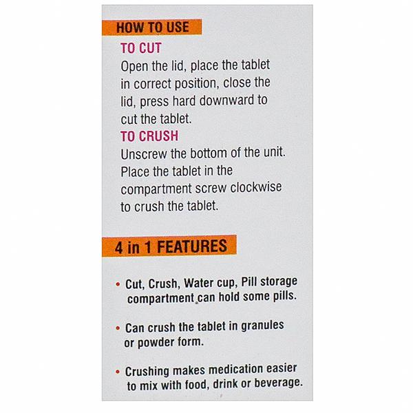 Product Information - You'll love the convenience of this compact tablet cutter and crusher. The removable tablet cutter has a sharp double-sided stainless steel blade that effortlessly cuts tablets in half for easier swallowing. The new flexible arms with ridges cut larger tables than the other tablet cutters and hold any size tablet steady while it's being cut. The crusher portion crushes tablets into a fine powder making medication easier to mix with food or a beverage. Easily coverts to a drinking cup an has a built-in pill container to carry medication or vitaminsIdeal for- Crushing Tablets