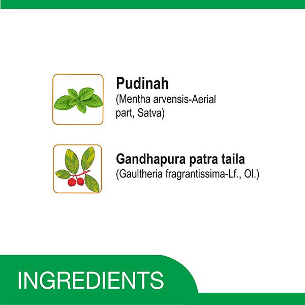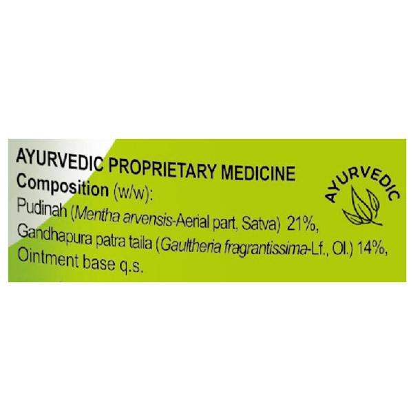 Pudina (Mentha arvensis-Aerial part, Satva),Gandhapura patra taila (Gaultheria fragrantissima-Lf., Ol.),Ointment base q.s.Directions for Use: