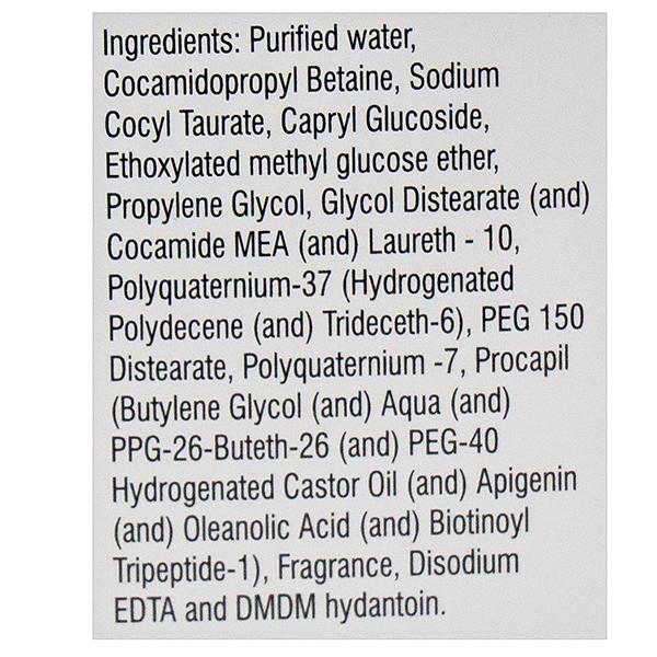Purified Water, Cocamidopropyl Betaine, Sodium Cocyl Taurate, Capryl Glucoside, Ethoxylated Methyl Glucose Ether, Propylene Glycol, Glycol Distearate (and) Cocamide MEA (and) Laureth - 10, Polyquaternium-37 (Hydrogenated Polydecene (and) Trideceth-6), Peg 150 Distearate, Polyquaternium-7, Procapil, (Butylene Glycol (and) Aqua (and) PPG-26-Buteth-26 (and) PEG-40 Hydrogenated Castor Oil (and) Apigenin (and) Oleanolic Acid (and) Biotinoyl Tripeptide-1), Fragrance, Disodium EDTA and DMDM hydantoin
