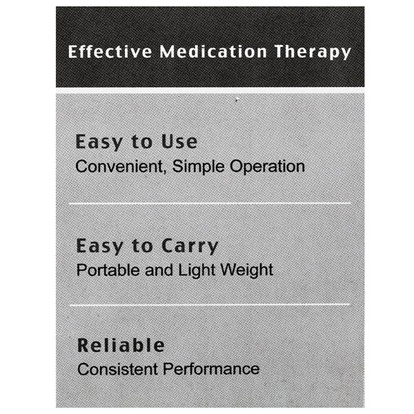 This ultra-compact and lightweight Nebulizer System features a piston pump and has a one-button operation system for ease of use. Its unique compact design effectively delivers the prescribed medication to the bronchial lung passages in the form of aerosol mist for easy inhalation. The particle size (expressed as mass median aerodynamic diameter) is 4 µm, which is of critical importance, to penetrate the droplet deep in the lung passage.