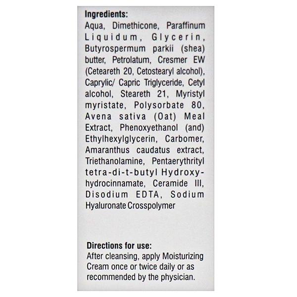 Aqua, Dimethicone, Paraffinum Liquidum, Glycerin, Butyrospermum parkii (shea) butter, Petrolatum, Cresmer EW (Ceteareth 20, Cetostearyl alcohol), Caprylic/ Capric Triglyceride, Cetyl alcohol, Steareth 21, Myristyl myristate, Polysorbate 80, Avena sativa (Oat) Meal Extract, Phenoxyethanol (and) Ethylhexylglycerin, Carbomer, Amaranthus caudatus extract, Triethanolamine, Pentaerythrityl tetra-di-t-butyl Hydroxy-hydrocinnamate, Ceramide Ill, Disodium EDTA, Sodium Hyaluronate Crosspolymer