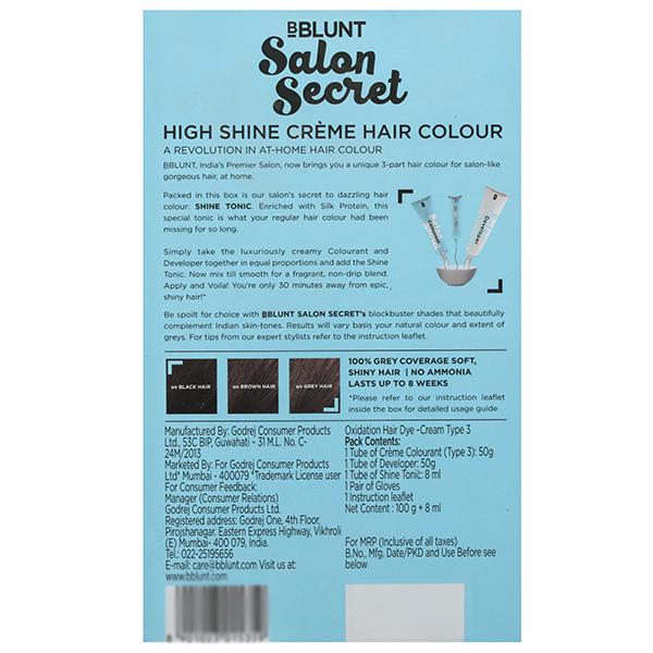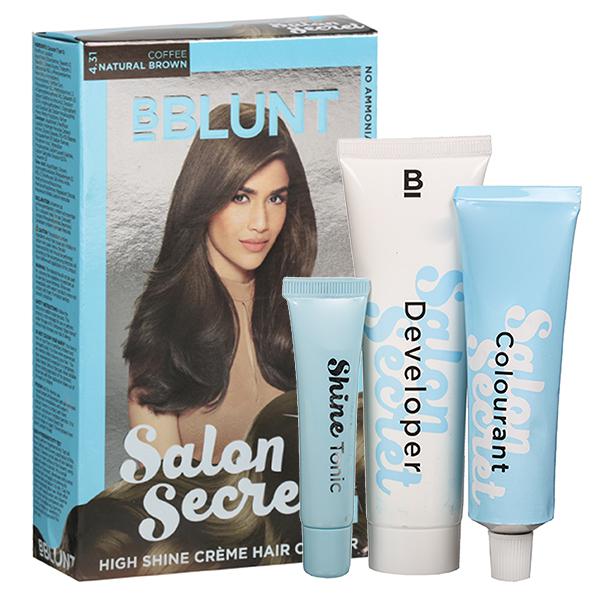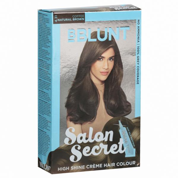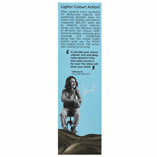 BBLUNT Salon Secret High Shine Crème Hair Colour is a range of salon-quality hair colour created especially for Indian hair textures and skin tones. The range is a first of its kind, Indian hair-expert-developed, no-ammonia formula that ensures 100% grey coverage whilst delivering rich, vibrant colour and moisture-locked hair with spectacular shine, lasting up to 8 weeks. The experts at BBLUNT took into account the most common grievances faced post hair color and worked to develop a 3-part v/s the regular 2-part formula - their Salon Secret - Shine-Tonic. This revolutionary addition, when added to the creamy colorant and developer boosts the richness of the color giving it the ultimate gloss and nourishing each strand as it colors it - one that your regular at-home hair color has been missing for so long. It leaves your hair looking vibrant with colour, incredibly shiny and feeling smooth after use. Depending on what you fancy but more importantly what goes with your skin tone, you can choose from a variety of soft-warm browns like Honey caramel, Mahogany to Deep Burgundy or wine, Rich Chocolates, Coffee Browns and Vibrant reds. For long-lasting vibrant colour and to prevent your colour from fading in the harsh sun, use the BBLUNT range of colour protect shampoos, conditioners and serums, specific to your hair type.