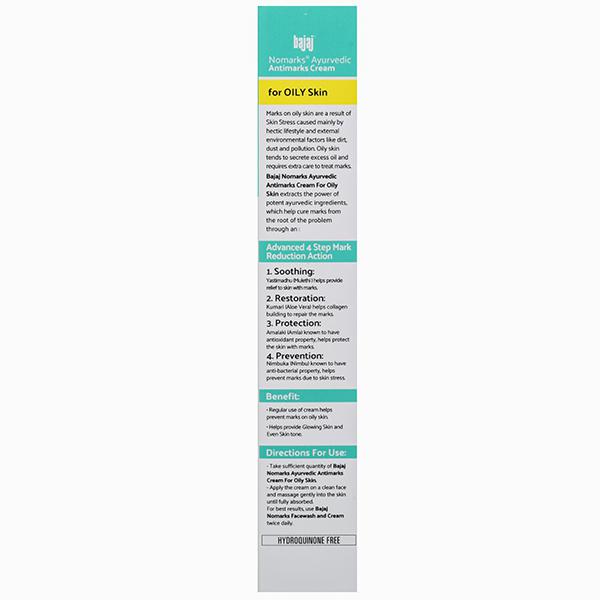 Product Information – New Bajaj Nomarks Cream for Oily Skin is an Ayurvedic skin safe formulation with the goodness of Emblica, Aloe Vera & Lemon which penetrates the skin layers and help prevent occurrences of pimples and marks. Enriched with Anti Bacterials, Herbal Micronutrients, Anti Oxiants and Organic Actives; The New Bajaj Nomarks Cream for Oily Skin provides your skin with oil control and gives it a glowing fairness.