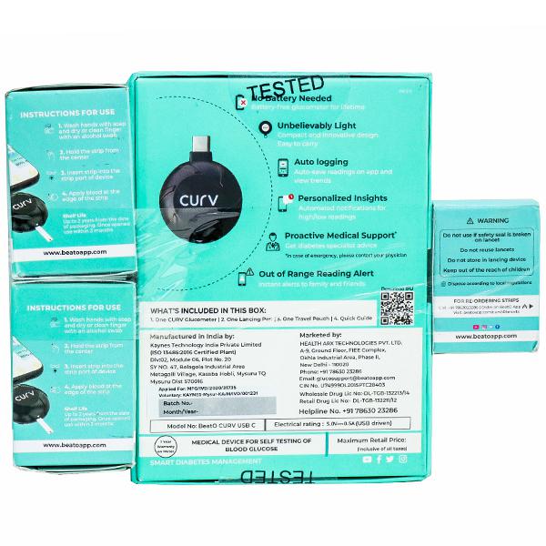 Number of content in sales package: 1 N BeatO Curv USB Connected Glucometer Kit (With BeatO Sterile Lancets 50N + Test Strips 50N)