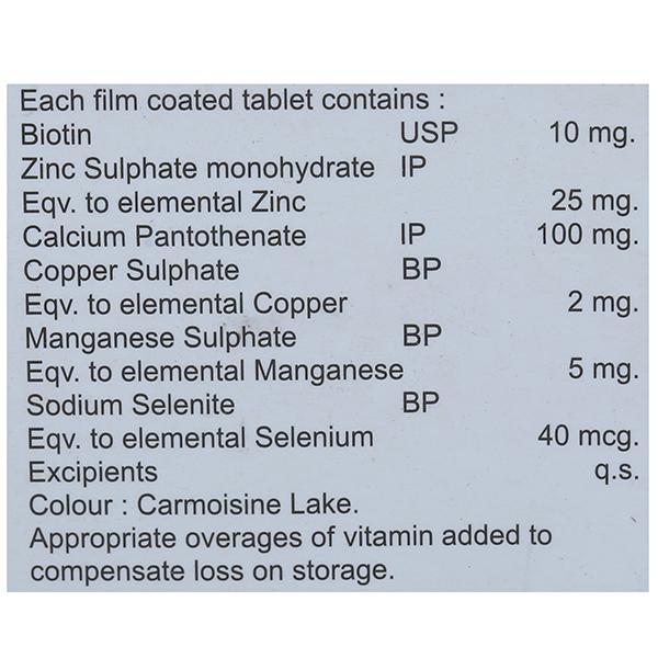 Biotin: 10 mg., Zinc Sulphate monohydrate Equivalent to elemental Zinc: 25 mg., Calcium Pantothenate: 100 mg., Copper Sulphate Eqv. to elemental Copper: 2 mg., Manganese Sulphate Eqv. to elemental Manganese: 5 mg., Sodium Selenite Equivalent. to elemental Selenium: 40 mcg., Excipients q.s.