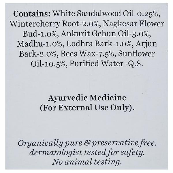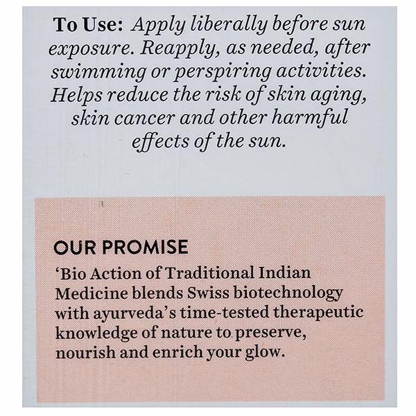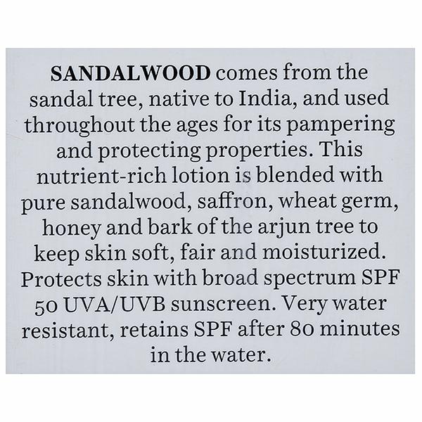This nutrient-rich lotion is blended with pure sandalwood, saffron, wheat germ, honey and bark of the arjun tree to keep skin soft, fair and moisturized. Protects skin with broad spectrum SPF 50 UVA/UVB sunscreen. Very water resistant, retains SPF after 80 minutes in the water