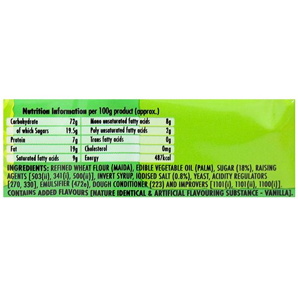 Refined Wheat Flour (Maida), Edible vegetable Oil(palm), sugar, liquid glucose, raising agent [503(ii), 500(ii), 450(i)], Butter (1.2%), Black Salt, Milk Solids, Edible vegetable product (1%), iodised salt, acidity regulator [341(ii)], Dough conditioner (223) and improver [1101(i)].