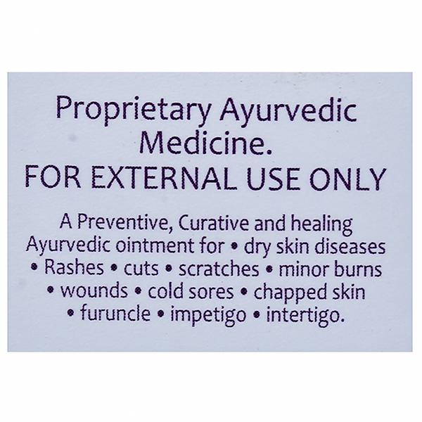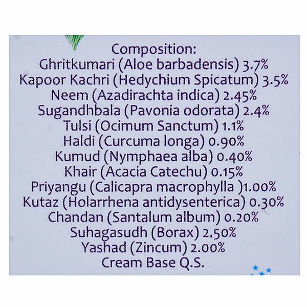 Ghritkumari (Aloe barbadensis): 3.7%, Kapoor Kachri (Hedychium spicatum): 3.5%, Neem (Azadirachta indica): 2.45%, Sugandhbala (Pavonia odorata): 2.4%, Tulsi (Ocimum sanctum): 1.1%, Haldi (Curcuma longa): 0.90%, Kumud (Nymphaea alba): 0.40%, Khair (Acacia Catechu): 0.15%, Priyangu (Calicapra macrophylla): 1.00%, Kutaz (Holarrhena antidysenterica): 0.30%, Chandan (Santalum album): 0.20%, Suhagasudh (Borax): 2.50%, Yashad (Zincum): 2.00%, Cream Base q.s.