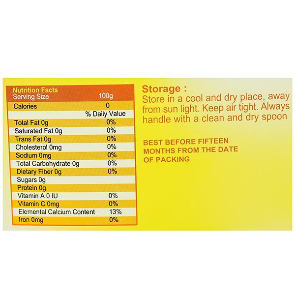 Total Fat: 0 g, Saturated Fat: 0 g, Trans Fat: 0 g, Cholesterol: 0 mg, Sodium: 0 mg, Total Carbohydrate: 0 g, Dietary Fiber: 0 g, Sugars: 0 g, Protein: 0 g, Vitamin A: 0 IU, Vitamin C: 0 mg, Elemental Calcium Content: 13 %, Iron: 0 mg.