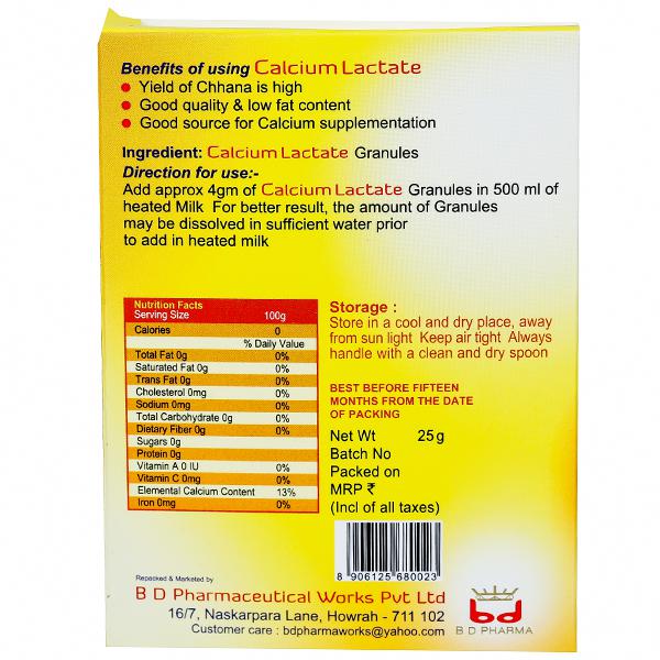 Calcium Lactate (BDS) is a good source for Calcium supplementation. It ensures higher production of chhana. It is good quality & low fat content.