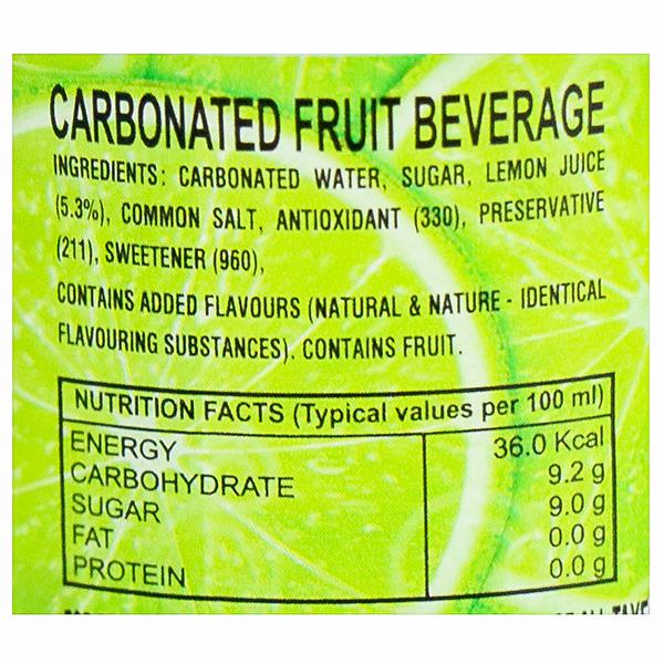 Carbonated Water, Invert Sugar Syrup, Lemon Juice (5%) Emulsifying & Stabilising Agent (INS 419 & INS 445) Acidity Regulator INS 338 Permitted Class 11 Preservative Antioxidant(INS 300)