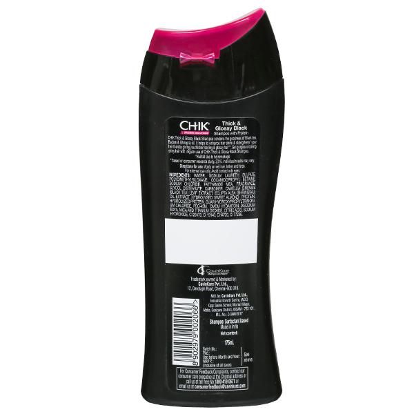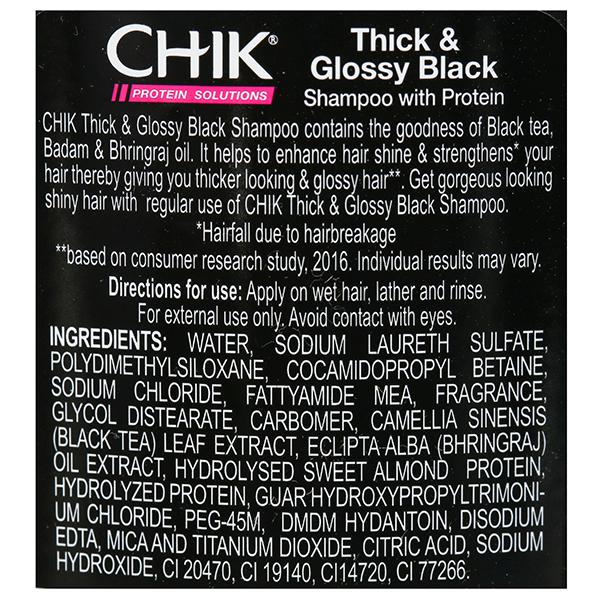 Chik Thick & Glossy Black shampoo contains the goodness of Black Tea, Badam protein & Bhringraj oil. It helps to enhance hair shine & strengthens your hair thereby giving you thicker looking & glossy hair. Get gorgeous looking shiny hair with every wash.