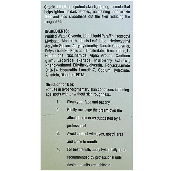 Citaglo Cream is a potent skin lightening formula that helps lighten the dark patches, maintain uniform skin tone, and also smoothens out the skin reducing the roughness.