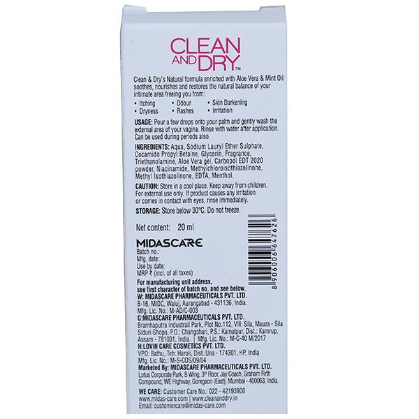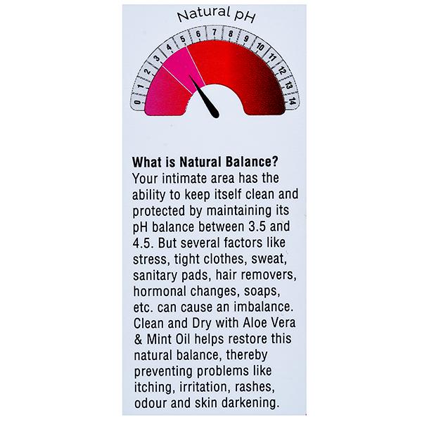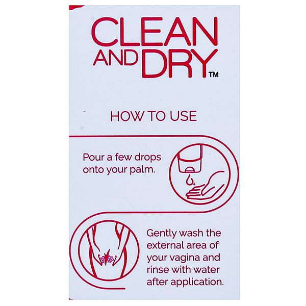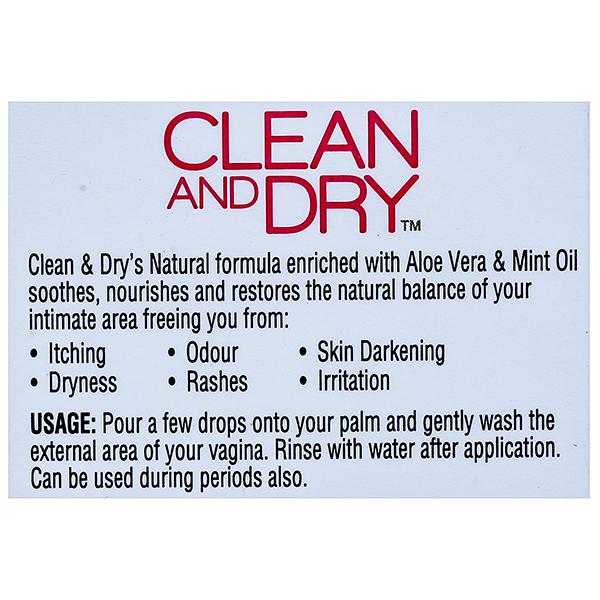 Clean & Dry's natural formula enriched with Aloe Vera & Mint Oil. It protects and cleanses the vaginal area while maintaining the necessary pH balance. Soothens, nourishes and restores the natural balance of your intimate areas from itching, odour & dryness. Clean and Dry Wash is part of a revolutionary range of products for feminine hygiene.How to use -