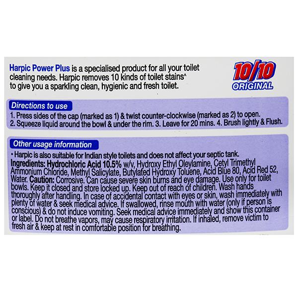 Product Information- A specialized all-in-one product, Harpic Power Plus is the ultimate one stop solution for all your toilet cleaning needs. Unlike ordinary toilet cleaners Harpic Power Plus has a thick liquid formula that clings to the toilet surface to clean deeply from the rim to the u-bend. Regular use of Harpic toilet cleaner prevents the build-up of stains in the toilet bowl and keeps it visibly clean with effective removal of germs in the toilet. Harpic’s strategically bent bottleneck shape lets you pour the liquid into deep corners under the toilet rim, without letting your hands touch giving you all round cleaning. Harpic is also suitable for Indian style toilets and does not affect your septic tank.