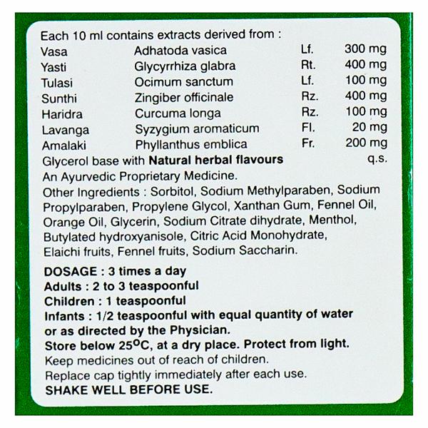 Vasa (Adhatoda vasica): 300 mg, Yasti (Glycyrrhiza glabra): 400 mg, Tulsi (Ocimum sanctum): 100 mg, Sunthi (Zingiber officinale): 400 mg, Haridra (Curcuma longa): 100 mg, Lavanga (Syzygium aromaticum): 20 mg, Amalaki (Phyllanthus emblica): 200 mg