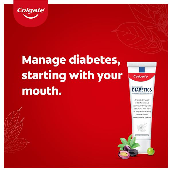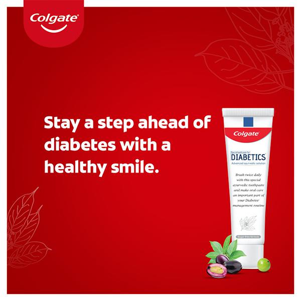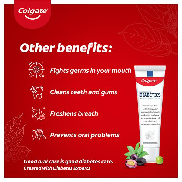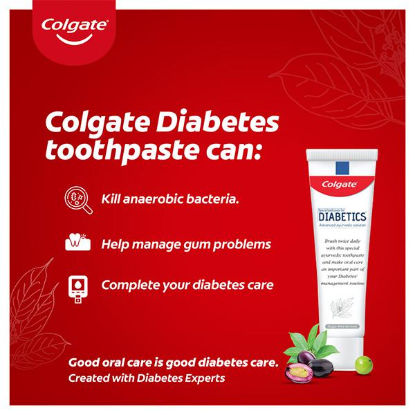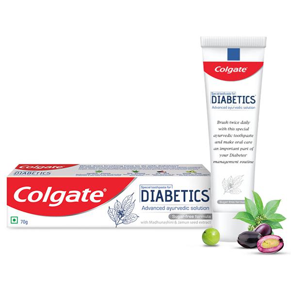 - Colgate Diabetics is a tailor-made ayurvedic toothpaste, containing gurmar/madhunashni is known for healing wounds, it is also a well-known sugar destroyer