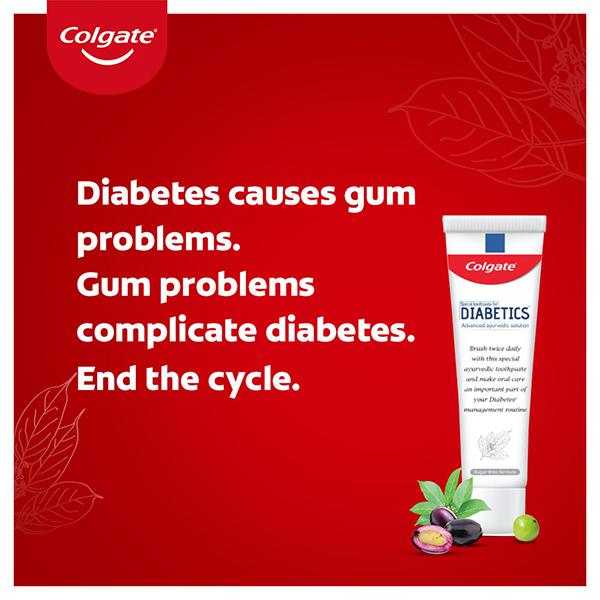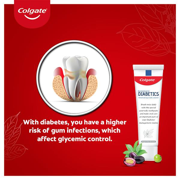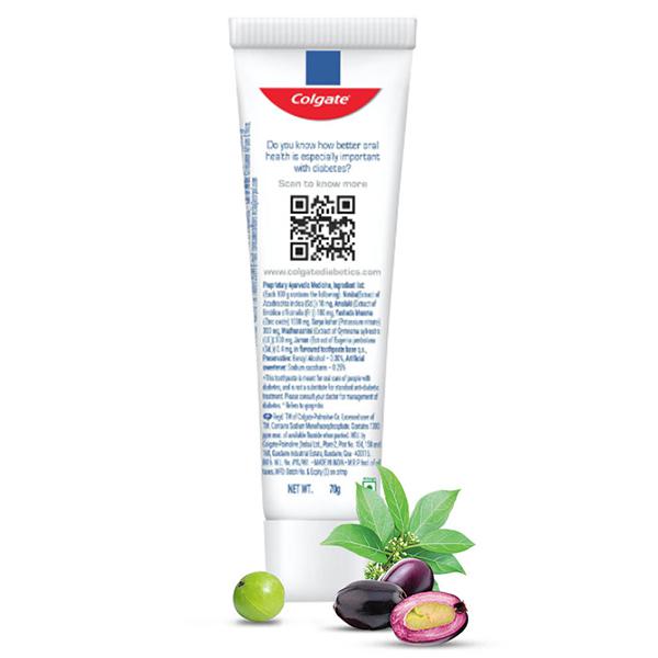 - Colgate Diabetics is a tailor-made ayurvedic toothpaste, containing Gurmar/Madhunashini - known for healing wounds, it is also a well-known sugar destroyer, Jamun seed extracts - well known astringent and Neem that is a known for its anti-germ and anti-inflammatory properties