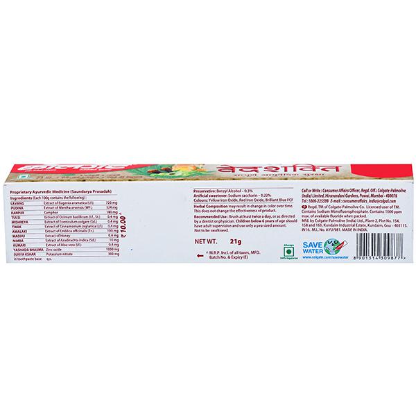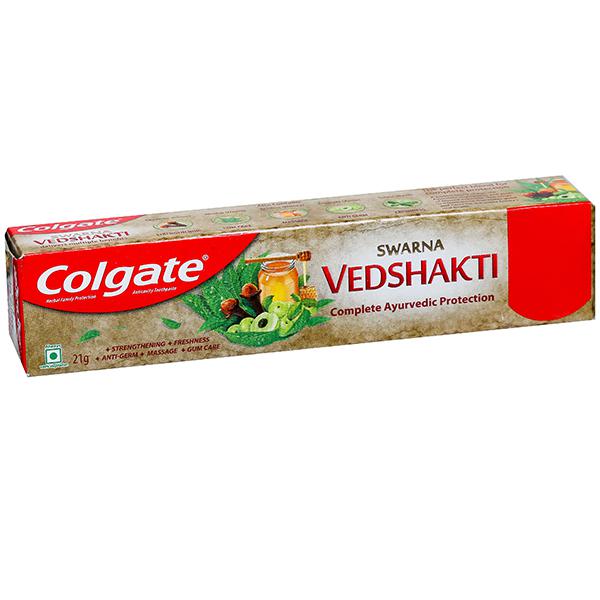 Product Information - Colgate swarna vedshakti is created with ayurvedic expertise. Contains the goodness of lavanga, nimba, madhu, amalaki, tulasi, karpoor, pudina, mishreya, twak, yavanika, kumari. Colgate swarna vedshakti protects against multiple common teeth and gum problems and promotes good oral health.