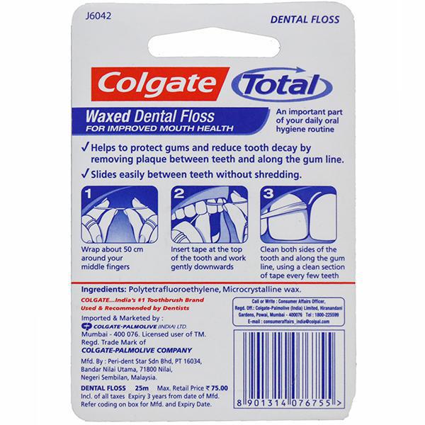 Colgate Total Floss slides easily between teeth without shredding. This floss was designed to make daily flossing easy and comfortable for patients. The advanced technology in use in the floss ensures that the floss slides easily between teeth without shredding. Dentists and hygienists recommend daily brushing and flossing to help maintain strong and healthy teeth and gums. Daily flossing will help to keep plaque from building up and remove food particles from the places between teeth and around the gumline where even the most effective brushing can't reach.