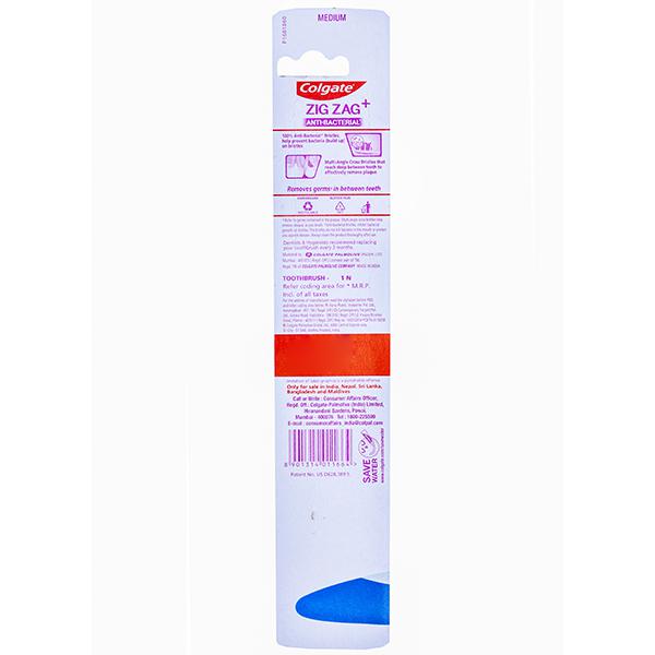 Product Information - Colgate Zigzag + Anti Bacterial Medium Toothbrush comes with multi-angle zig zag bristles designed to reach deep between teeth to effectively remove plaque. The rubber cushioned handle provides comfortable grip & superior brushing control. This Toothbrush comes with unique circular pattern soft bristles that help remove tooth stains, leaving you with a shining smile and clean gums. Its flexible neck reduces pressure on gums and massages them for a comfortable cleaning experience.