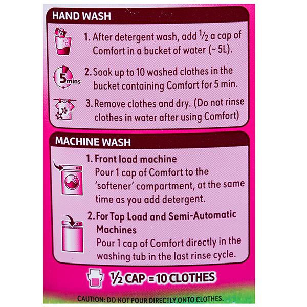 How to Use - After washing your clothes with laundry detergent, pour ½ a cap of Comfort in a bucket of water, and soak your clothes for 5 mins. Remove and dry them. Don’t rinse the clothes again.