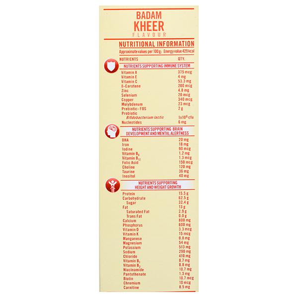 Ingredients - Milk, Sugar, Peanut oil, Maltodextrin, Fructo oligosaccharide, Flavours, Mineral mix (Potassium dihydrogen phoshate, Calcium phosphate, Lipofer, Ferrous sulphate, Zinc sulphate, Manganese sulphate, Copper sulphate, Potassium 10 date, Sodium selemite, Sodium chromate, Sodium moly10 date), Annatto, Cardamom powder, DHA, Niacinamide, Calcium pantothenate, Folic acid.