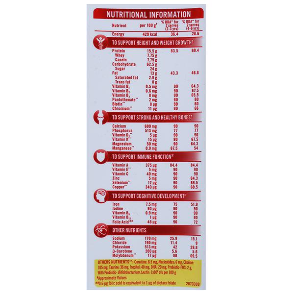 Ingredients - Milk Solids (34.2%), (Skimmed milk powder, Whey protein concentrete(9.33%), Casein (1.96%)), Sugar, Maltodextrin, Peanut oil, Minerals, Fructooligosaccharide,Annatto (INS160b(ii)), Vitamins,Thickener (INS 415), DHA, Taurine,Inositol, L-Carnitine, Nucleotides, Bifidobacterium lactis.