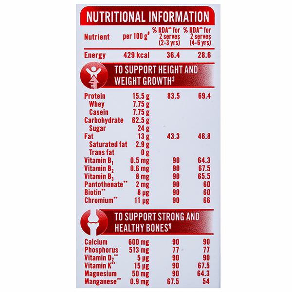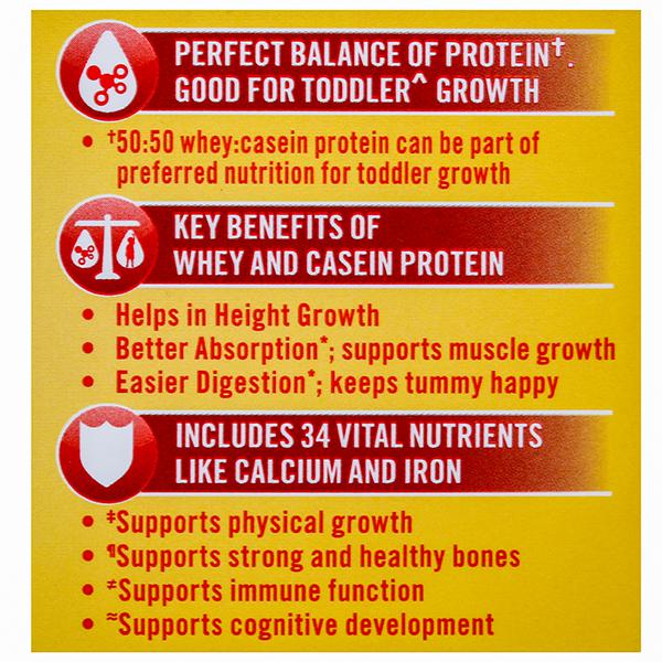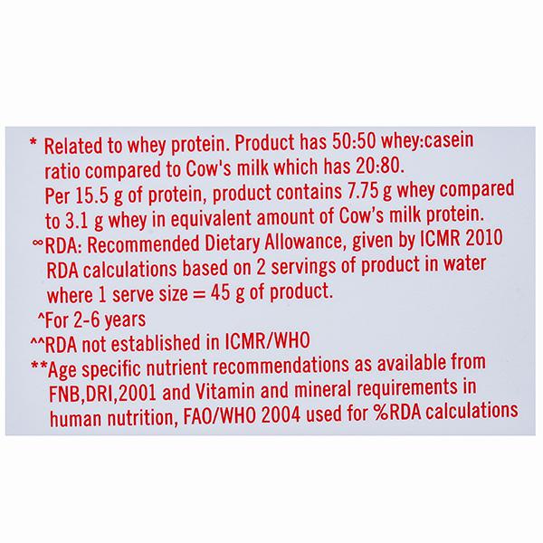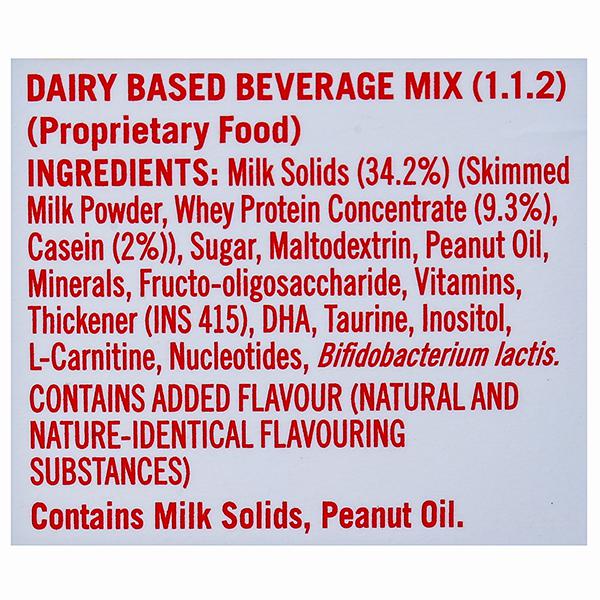 Ingredients - Milk Solids (34.2%), (Skimmed milk powder, Whey protein concentrete(9.3%), Casein (1.96%)), Sugar, Maltodextrin, Peanut oil, Minerals, Fructooligosaccharide,Annatto (INS160b(ii)), Vitamins,Thickener (INS 415), DHA, Taurine,Inositol, L-Carnitine, Nucleotides, Bifidobacterium lactis.