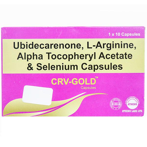 Crv Gold Capsule is advised for the treatment and prevention of heart diseases such as heart failure, heart attack, etc. It contains Ubidecarenone, L-Arginine, Alpha Tocopheryl Acetate and Selenium, these help in maintaining heart health, regulation of blood glucose level in the body and protects against cell oxidation (ageing) due to stress. It is also useful for gum diseases and kidney problems.