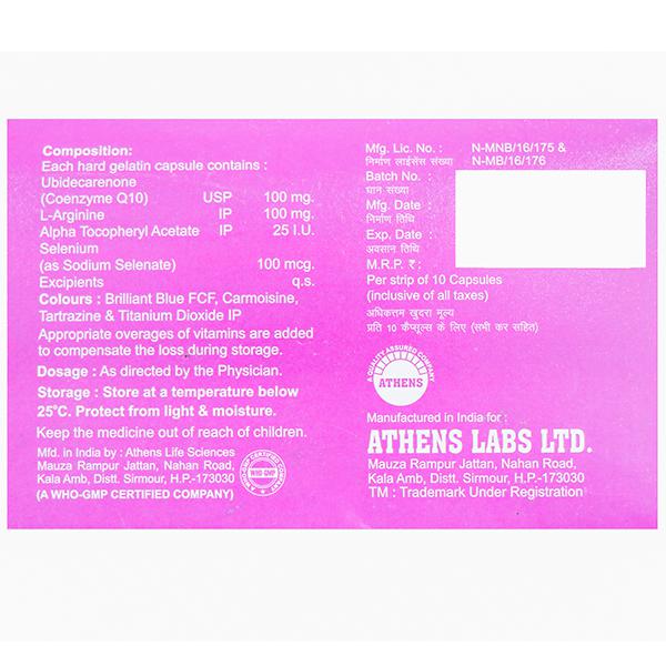 Ubidecarenone (Coenzyme Q10): 100 mg, L-Arginine: 100 mg, Alpha Tocopheryl Acetate: 25 I.U., Selenium (as Sodium Salonate): 100 mcg, Excipients: q.s.