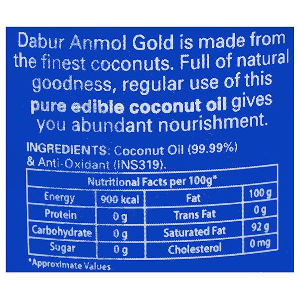Dabur Anmol Gold Pure Coconut Oil is made from the finest coconuts. Full of the goodness of coconut, regular use of this edible coconut oil gives you abundant nourishment.