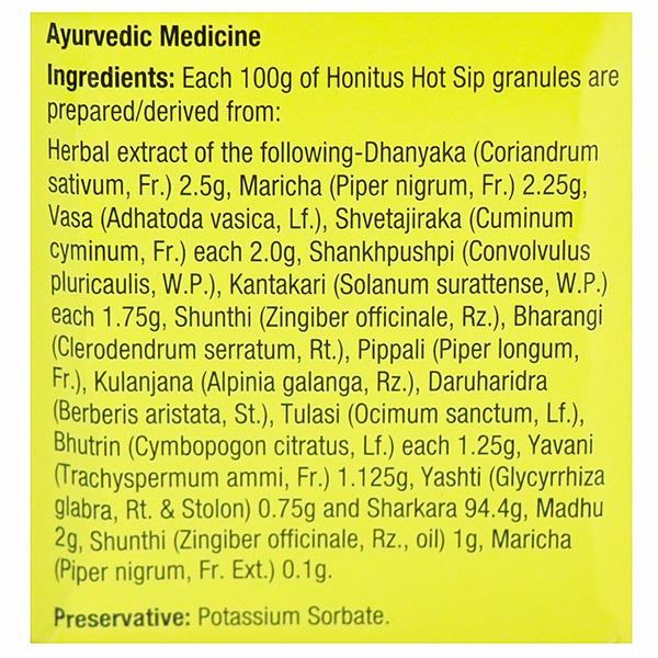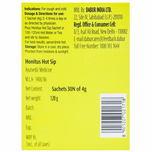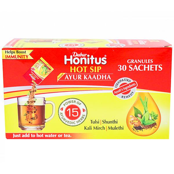 Dabur Honitus Hot Sip Ayurvedic Kadha is a unique blend of 15 powerful ayurvedic herbs including shunthi, kantakari and tulsi combined with honey to give you a potent and effective natural formulation for effective relief from cough and cold. Just stir it in hot water, drink and experience the goodness of Ayurveda. Dabur Honitus range of cough syrup, cough drops, hot sip and Madhuvaani are made using traditional herbs and natural ingredients that provide quick cough relief and help improve immunity to further combat the underlying illness.