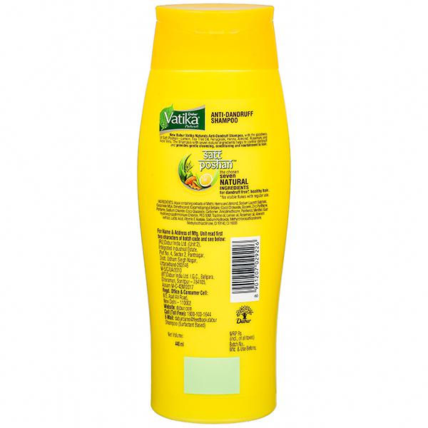 Dabur Vatika Naturals Anti Dandruff Shampoo Lemon & Methi with the goodness of Satt Poshan (7 natural ingredients) such as Lemon, Tea Tree Oil, Fenugreek, Henna, Almond, Rosemary & Aloevera. The shampoo with seven natural ingredients helps to control dandruff and provides gentle cleansing, conditioning & nourishment to hair.