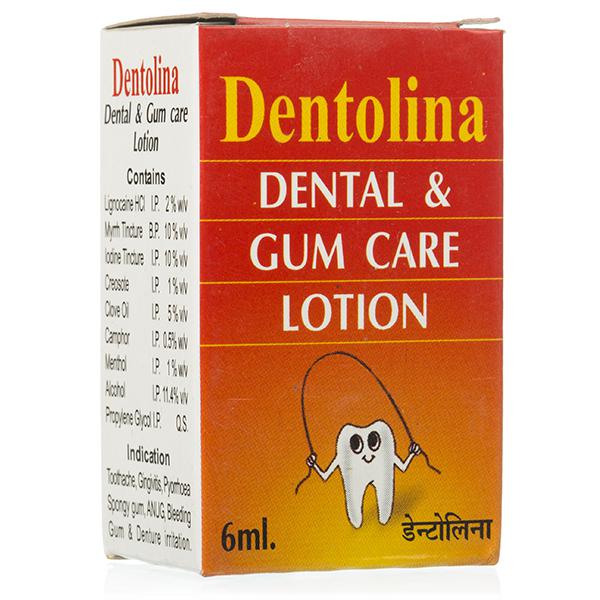 Dentolina lotion is indicated in dental infection, Gingivitis, Bleeding Gum and Pain during tooth extraction. Consult a doctor before using this medicated lotion.The ingredients are Lignocaine Hydrochloride I.P. 2% v/v, Myrrh Tincture B.P. 10% v/v, Iodine Tincture I.P. 10% v/v, Creosote I.P. 1% v/v, Clove Oil I.P. 5% v/v, Camphor I.P. 0.5% w/v, Menthol I.P. 1% w/v, Alcohol I.P. 11.4% v/v, Propylene Glycol I.P. – q.s. To use, apply over gum or the affected parts 3 times daily with a cotton swab. It comes in a 6ml bottle.