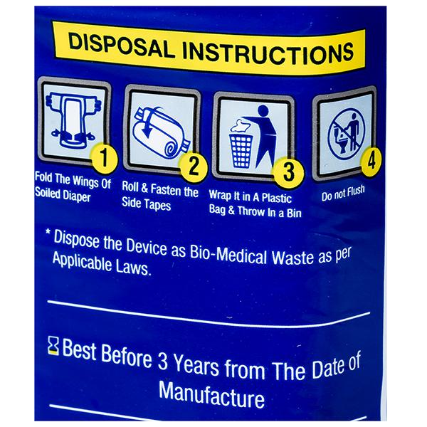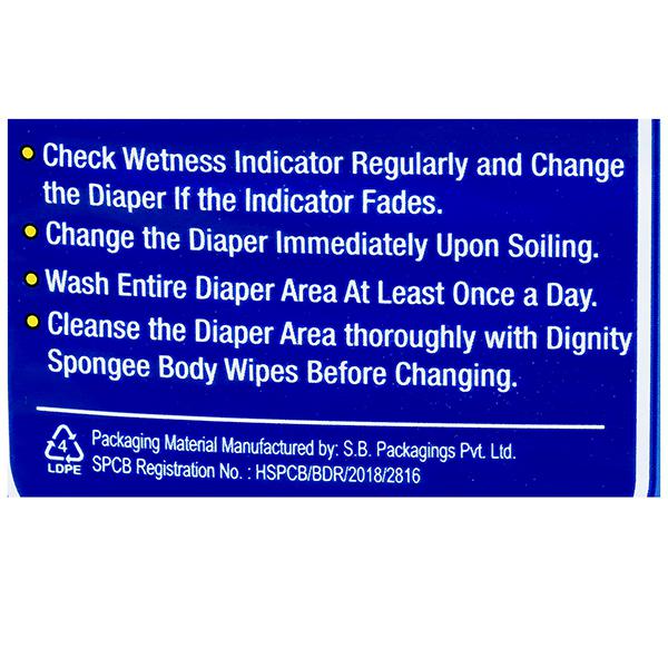 • Extra locking layer locks the liquid immediately and keeps the user dry and clean and wetness indicator fades in colour when the diaper needs changing.