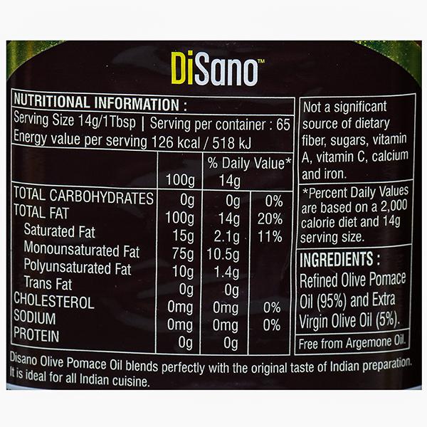Disano Olive Pomace oil has a neutral taste and aroma. It is ideal for all Indian cooking especially for deep frying, roasting, sauteing and grilling as it has a high smoking point. The olive oil does not change the original taste of daily Indian cooking and is less absorbed in food, ensuring a low intake of oil. You can prepare all types of cuisines using Disano Olive Pomace Oil.