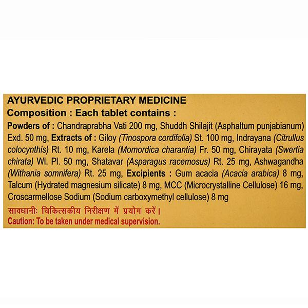 Ingredients: Powders of Chandraprabha vati,Shuddh Shilajit; Extracts of Giloy,Indrayana,Karela, Chirayata,Shatavar & other natural ingredients