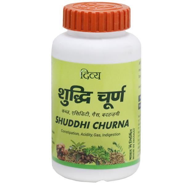 Patanjali Divya Shuddhi Churna is a powdered form which is used for constipation, digestive disorders, upset stomach, exertion, dermatophytoses and gastroenteritis. It also assists in the treatment of fussiness and menstrual pain.