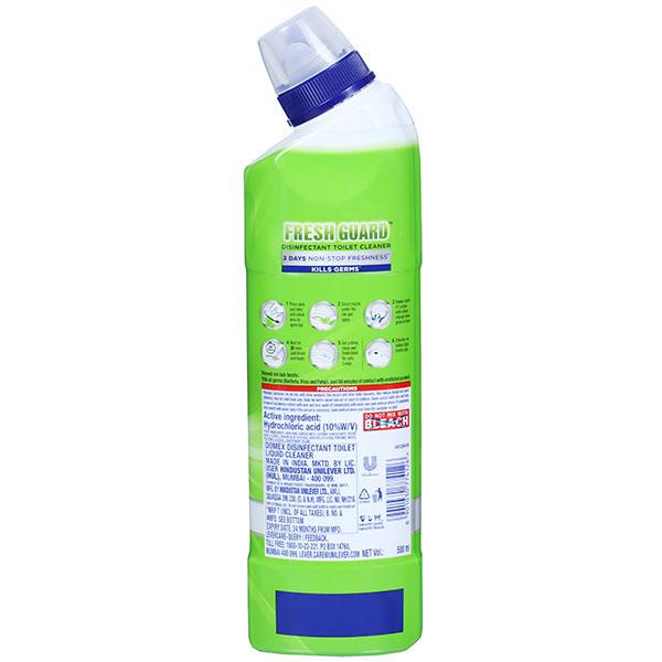 Product Information - Domex Fresh Guard Disinfectant Toilet Cleaner with freshness guard technology leaves a protective layer on your toilet commode/ceramic surface, thereby reducing water and germs adherence to the toilet surface. It contains a powerful formula which removes limescale and stains from the toilet by forming a stain resistant layer on the toilet surface leaving it disinfected, fresh and clean. It helps in removing germs that live on the surface, reducing the occurrence of stain marks and fights unpleasant smell. The ideal thickness of the toilet cleaner ensures an even spread across the toilet bowl and the innovative, colour changing formula ensures that all the germs are killed. Domex Fresh Guard Disinfectant Toilet Cleaner is available in two refreshing fragrance options - ocean fresh and lime fresh.
