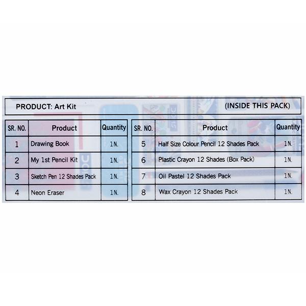 Included Components - 1 Drawing Book, 1 My 1St Pencil Kit, 1 Sketch Pen 12 Shades Pack, 1 Neon Eraser, 1 Half Size Colour Pencil 12 Shades Pack, 1 Plastic Crayon 12 Shades, 1 Oil Pastels 12 Shade, 1 Wax Crayon 12 Shades Pack