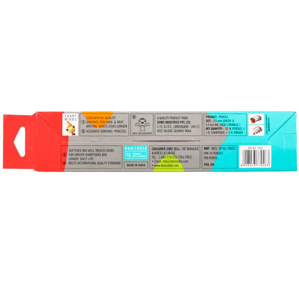 Product Description Wooden pencils that offer a super dark and smooth writing experience. Triangular shape gives it an easy grip making it less tiring for children to hold for long duration. Their special bonding prevents lead breakage reducing the need to sharpen often. These pencils come in pack of 10 with 1 dust-free eraser and 1 sharpener. Pencils in classic black colour. The perfect writing companion for children at school or adults at home and office.