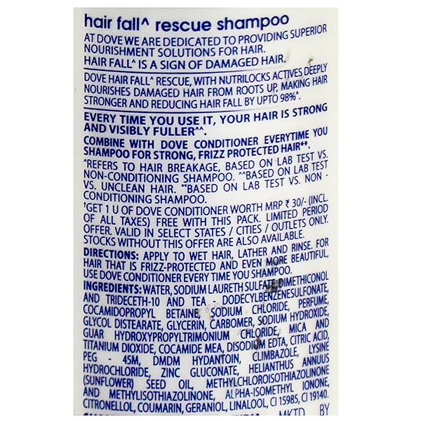 Dove Hair Fall Rescue Shampoo helps reduce hair fall caused due to damage. It contains Nutrilock actives that locks in the nourishment, strengthens and protects hair against hair fall. It nourishes from the roots up and reduces hair fall, giving visibly fuller hair with regular use. Directions to use Dove Hair Fall Rescue Shampoo: 1. After washing your hair thoroughly, take 2 to 3 drops of the hair fall rescue shampoo, equal to size of a coin, on your palm. 2. Then apply the shampoo, gently massaging it all over your hair from the roots to the tips. 3. Leave the shampoo on your hair for a couple of minutes and then rinse it off completely. For best results, use Dove Hair Fall Rescue Conditioner after every wash.