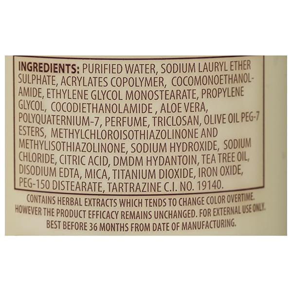 D.M Water, Disodium Edta, Sodium Lauryl Ether Sulphate, Coco Mono Ethanol Amide, Ethylene Glycol Mono Stearate, Polyquarternium-7, Acrylates Copolymer, Coco Dl Ethanol Amide, Propylene Glycol, Triclosan, Tea Tree Oil, Aloe Vera, Olive Oil-PEG-7-Ester, Methychloroisothiazolinone And Methylisothiazolinone, DMDM Hydantoin, Golden Powder, C.I. 19140, Sodium Hydroxide, Citric Acid, Perfume.