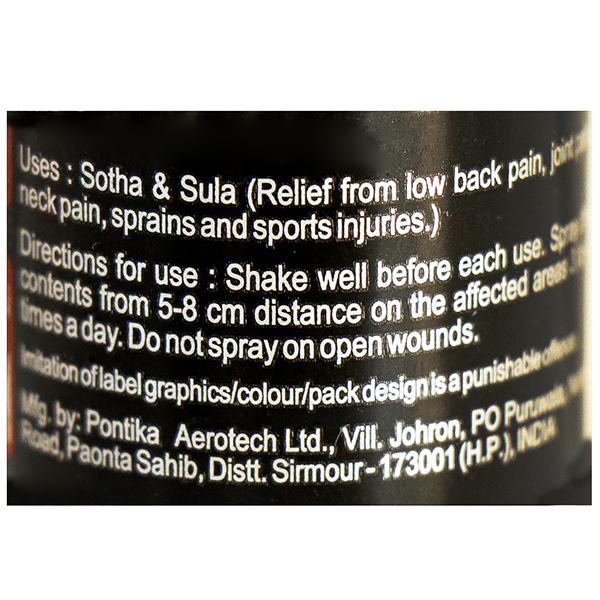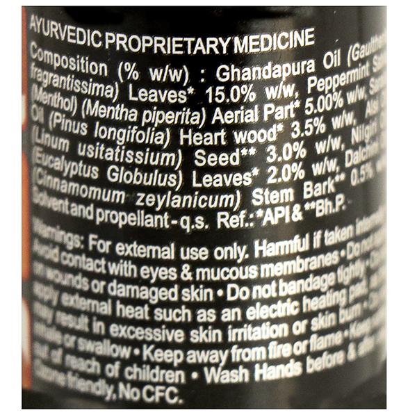 Ingredients : Each 100ml contains: lavang oil, kapoor, pudina oil, gandhpura oil, nilagiri oil, sarala oil, alsi oil, nirgundi oil, jyotismati oil, tulsi oil, base qs