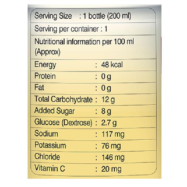 Energy: 48 Kcal, Protein: 0 g, Fat: 0 g, Total Carbohydrate: 12 g, Glucose (Dextrose): 2.7 g, Sodium: 117 mg, Potassium: 76 mg, Chloride: 146 mg, Vitamin C: 20 mg