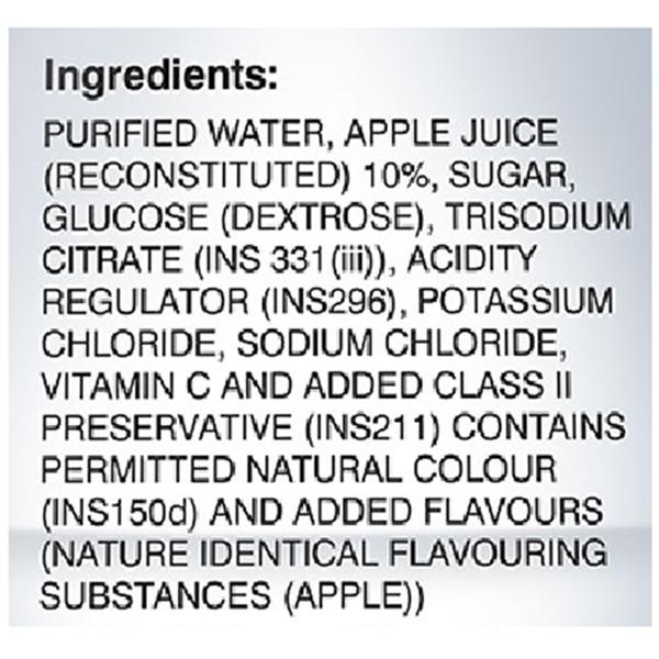 Purified Water, Apple Juice (Reconstituted) 10%, Sugar, Glucose (Dextrose), Trisodium Citrate (INS 331(iii)), Acidity Regulator (INS 296), Potassium Chloride, Sodium Chloride, Vitamin C And Added Class II Preservative (INS 211) Contains permitted natural colours (INS 150d), And Added flavours (Nature identical flavouring substances (apple))